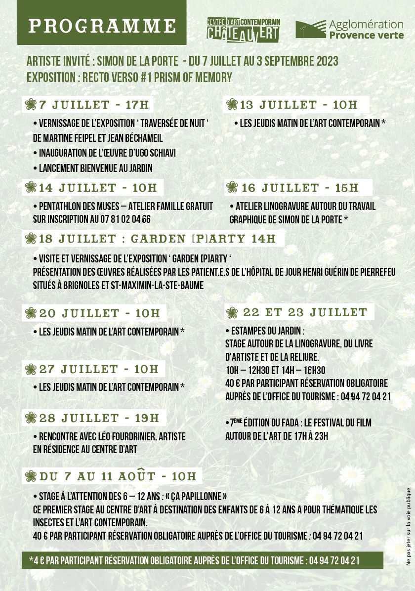 À cette occasion, a été invité l’artiste toulonnais Simon de La Porte qui fait entrer dans le centre d’art la nature qu’il qualifie de plus belle télé du monde. Cette exposition est intitulée PRISM OF MEMORY, titre récurrent donné à ses dessins. Il utilise des feutres, depuis début 2014, lors d’un long séjour à l’hôpital où il a été contraint de dessiner de la main gauche à l’époque. Il dit peindre avec des feutres. Un de ses motifs fétiches est la chaise en plastique qui lui est chère, car c’est un objet souvent anonyme et produit de manière internationale, qu’il observe avec tendresse.