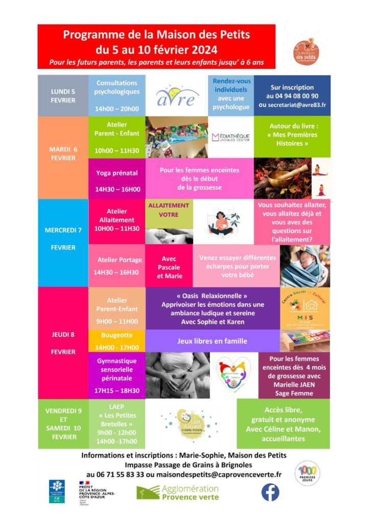 - Atelier de Gymnastique Sensorielle Périnatale jeudi 8 février 2024 à destination des femmes enceintes seules ou en couple, animé par Marielle JAEN, de l’association Réseau Parents Solidaires Provence Verte