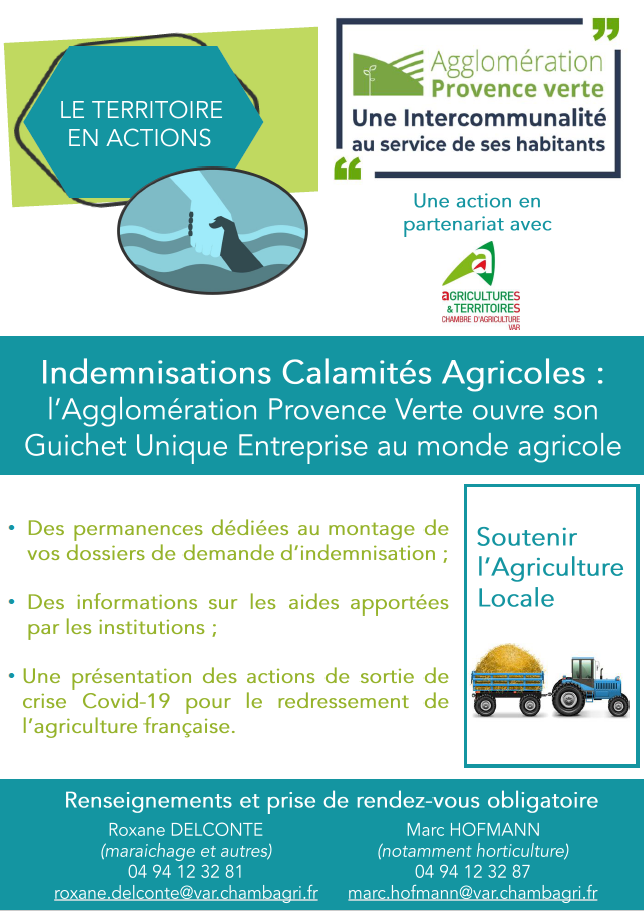 Tous les agriculteurs du territoire de la Provence Verte qui souhaitent obtenir des informations ou une aide pour le montage d’un dossier de demande d’indemnisation « Calamités agricoles » sont invités à contacter les personnes ci-dessous, afin d’obtenir un rendez-vous physique ou téléphonique :