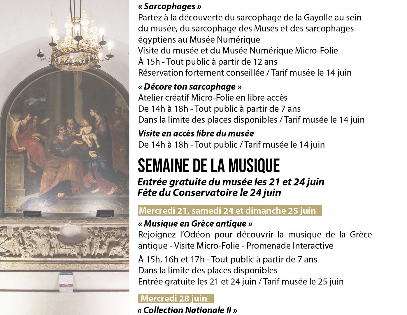 - 21 et 24 juin : Amateurs de musique, la « Semaine de la musique » sera l’occasion de partir en Grèce Antique pour découvrir la musique de cette époque à travers les promenades interactives. Des surprises vous attendent pour célébrer la Fête de Conservatoire le 24 juin…