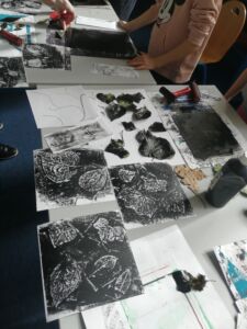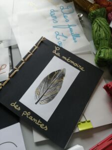 La mémoire des plantes est un atelier permettant l’expérimentation de la technique du monotype, la réalisation d’empreintes à partir de végétaux, l’écriture de poésies et la reliure d’un carnet.
