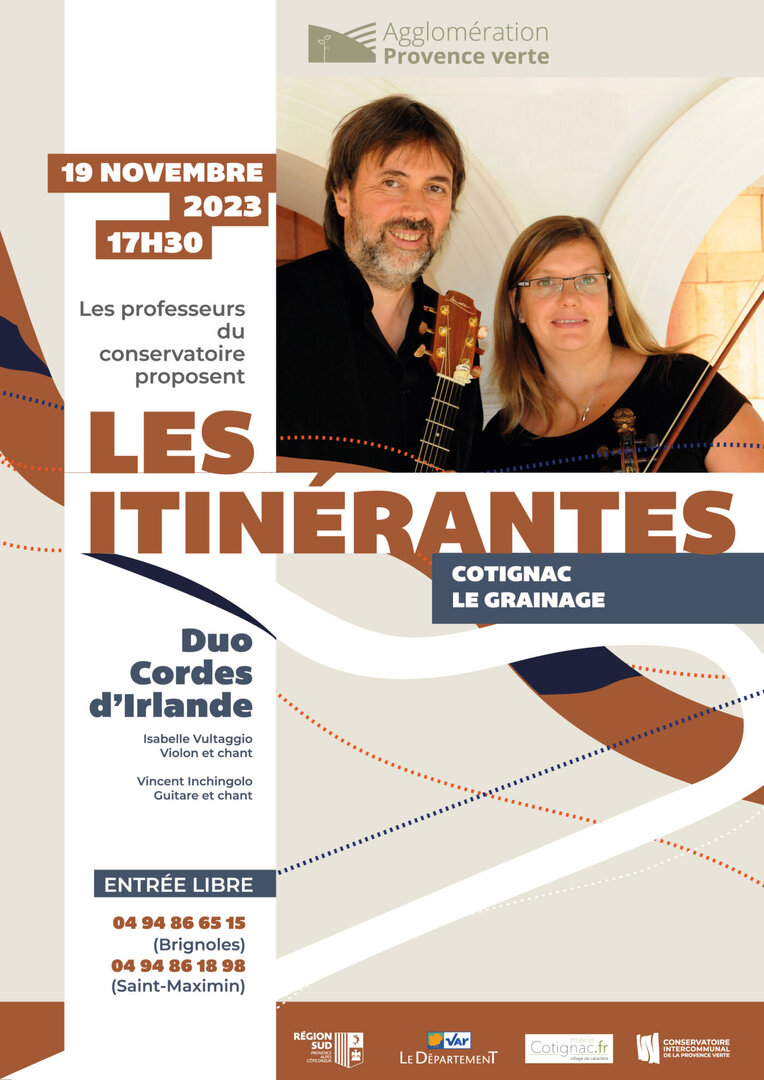 | GratuitLe Conservatoire Intercommunal de la Provence Verte propose aux communes une saison de concerts nommés « Les Itinérantes ». L’objectif de cette saison « hors les murs » est de rayonner sur l’ensemble du territoire de l’Agglomération avec des propositions artistiques qui émanent des professeurs/artistes du conservatoire.