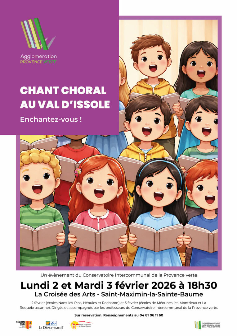 Le Conservatoire Intercommunal de la Provence verte, partenaire de l’Éducation nationale dans le cadre de sa mission d’Éducation Artistique et Culturelle, propose à douze classes de l’Agglomération (environ 300 enfants) de vivre l’expérience forte de concerts où les élèves chanteront accompagnés par des musiciens professionnels, professeurs au conservatoire.