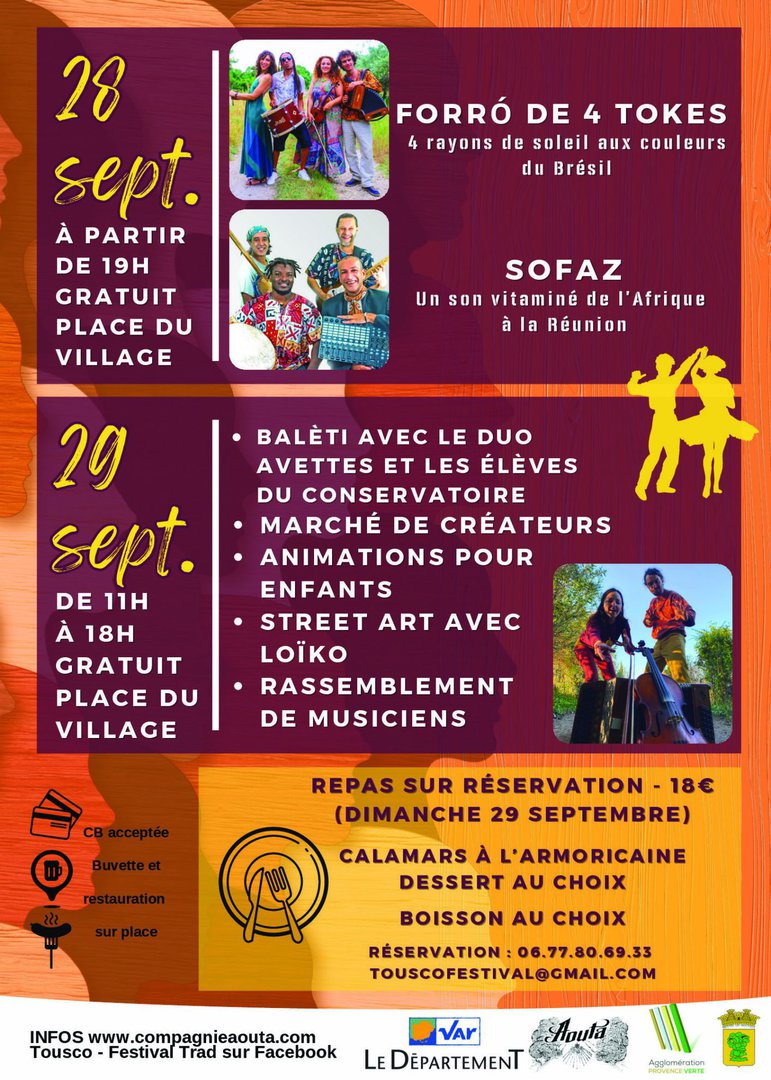 Le Tousco festival est porté par la Compagnie Aouta. C’est un festival itinérant en Provence Verte, une programmation éclectique de septembre à décembre avec comme empreinte les musiques traditionnelles et musiques du monde.
