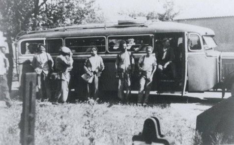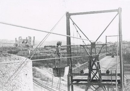 De gauche à droite : Le stockage du minerai en bordure de Nationale 7 aux Censiés (Brignoles), 1983 // Un groupe de mineurs prenant le bus à Mazaugues, 1951 /// Le câble aérien transportant le minerai depuis Mazaugues jusqu’à Tourves, 1947.