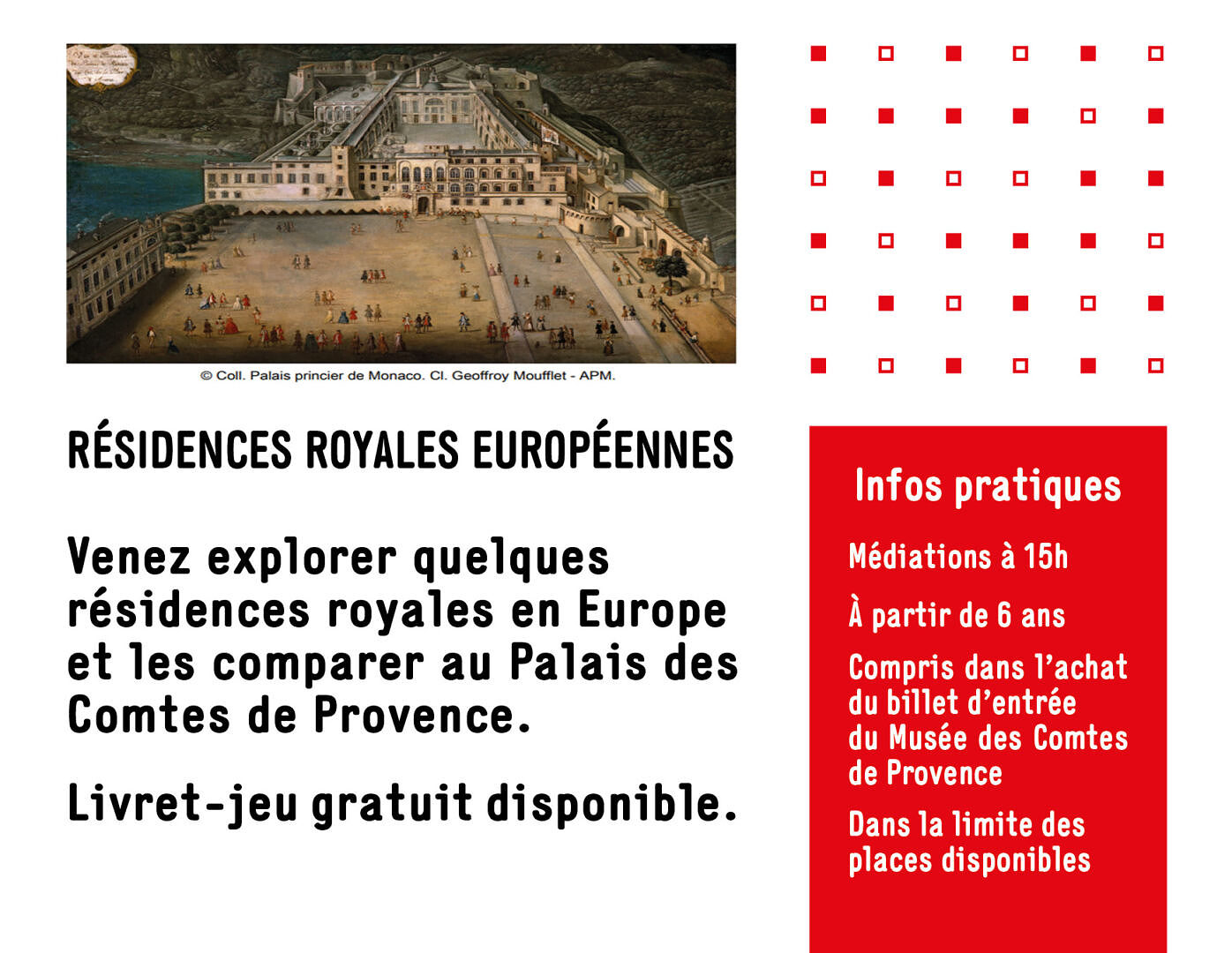 Vous explorerez quelques résidences royales en Europe et pourrez les comparer au Palais des Comtes de Provence.