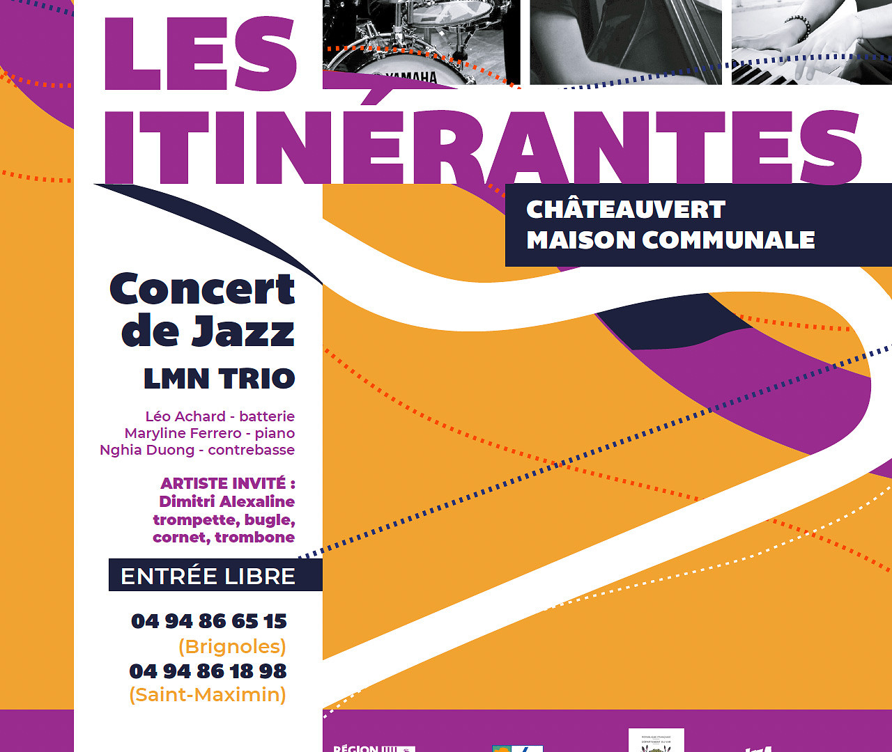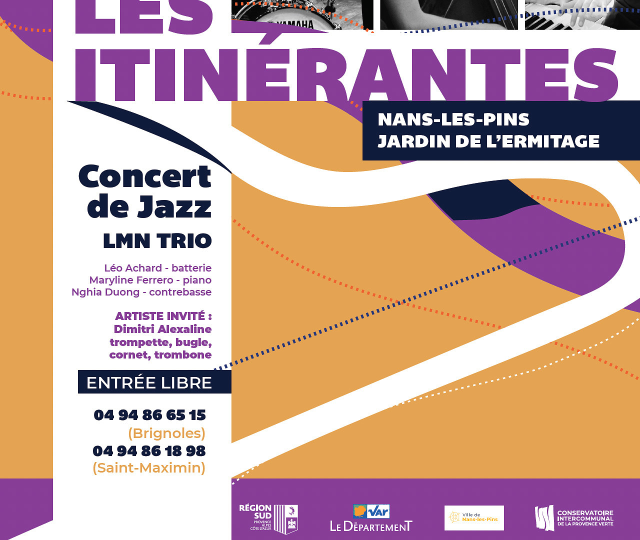 ChâteauvertDans le cadre des Itinérantes, le Conservatoire Intercommunal de la Provence Verte propose une série de concerts donnés par le groupe LMN Trio, composé de Léo Achard à la batterie, Maryline Ferrero au piano, Nghia Duong à la contrebasse et d’un artiste invité, Dimitri Alexaline à la trompette, bugle, et trombone. Samedi 8 juillet 2023 à 21h Maison communale de Châteauvert Entrée libre Renseignements auprès des secrétariats du conservatoire : Brignoles 04 94 86 65 15 / Saint-Maximin-la-Sainte-Baume 04 94 86 18 98