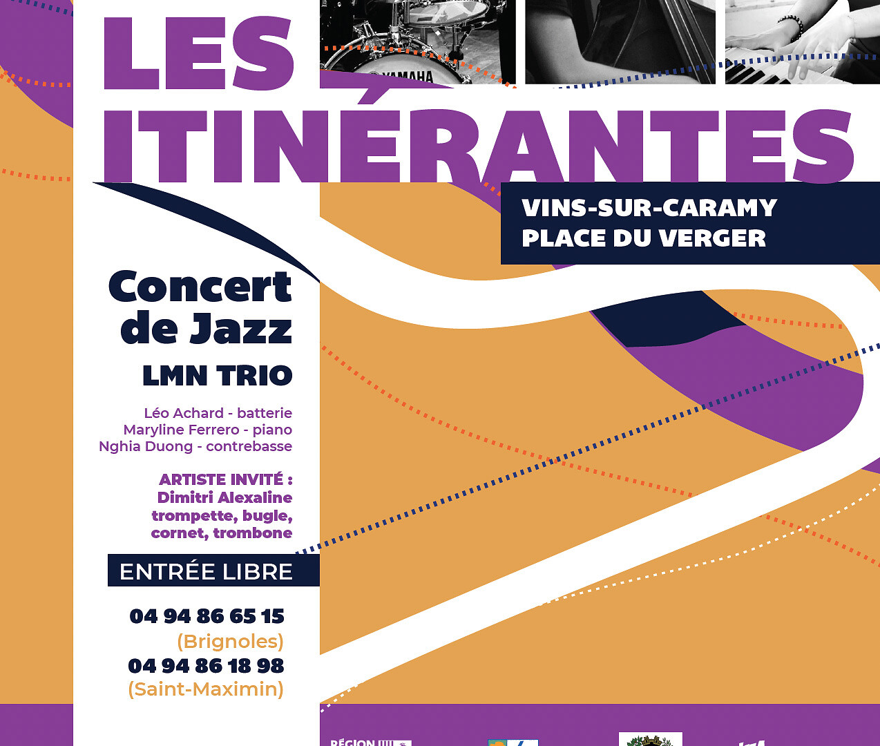 Vins-sur-CaramyDans le cadre des Itinérantes, le Conservatoire Intercommunal de la Provence Verte propose une série de concerts donnés par le groupe LMN Trio, composé de Léo Achard à la batterie, Maryline Ferrero au piano, Nghia Duong à la contrebasse et d’un artiste invité, Dimitri Alexaline à la trompette, bugle, et trombone. Vendredi 7 juillet 2023 à 19h Place du verger à Vins-sur-Caramy Entrée libre Renseignements auprès des secrétariats du conservatoire : Brignoles 04 94 86 65 15 / Saint-Maximin-la-Sainte-Baume 04 94 86 18 98