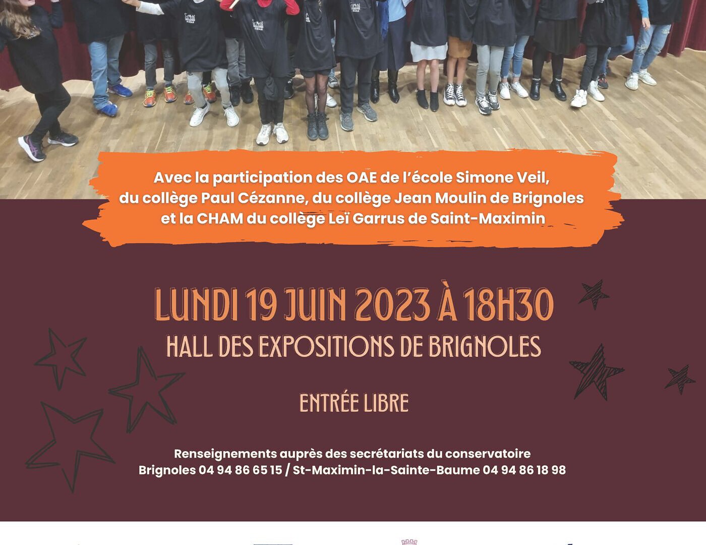Hall des expositions Cours Liberté, BrignolesLe Conservatoire Intercommunal de la Provence Verte vous invite à une soirée dédiée aux Orchestres À l’École du conservatoire. Tous seront réunis au Hall des expositions Lundi 19 juin 2023 à 18h30 Entrée gratuite Avec la participation des OAE de l’école Simone Veil, du collège Paul Cézanne, du collège Jean Moulin pour Brignoles et de la CHAM du collège Leï Garrus de Saint-Maximin. Renseignements auprès des secrétariats du conservatoire : Brignoles 04 94 86 65 15 / Saint-Maximin-la-Sainte-Baume 04 94 86 18 98
