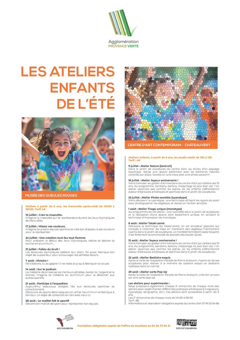 Cet été, les équipes du Centre d’Art Contemporain de Châteauvert et du Musée des Gueules Rouges de l’Agglomération Provence verte proposent des ateliers créatifs aux enfants âgés de 6 à 12 ans.