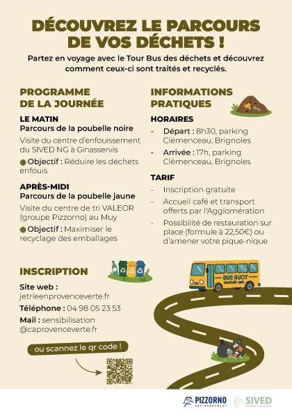 L’Agglomération Provence verte vous invite à découvrir le parcours de vos déchets : embarquez dans le Tour Bus qui vous conduira au centre d’enfouissement de vos ordures ménagères à Ginasservis (SIVED NG) et au centre de tri de vos emballages au Muy (VALEOR Pizzorno).