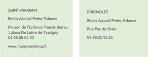 Il existe deux Relais Petite Enfance sur le territoire de la Provence Verte, l’un à Saint-Maximin, l’autre à Brignoles.